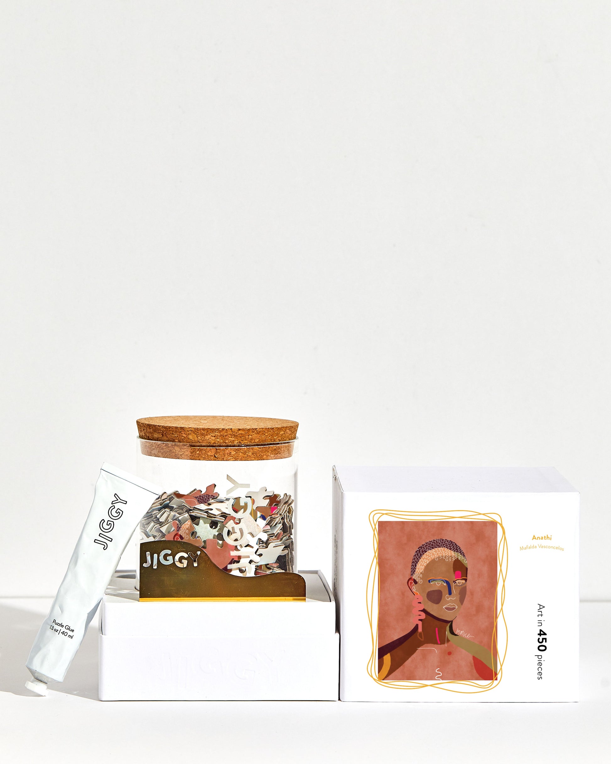 Each JIGGY puzzle comes in a reusable glass jar and includes a tube of puzzle glue, a straight-edge tool to spread the glue and a print of the art to follow.