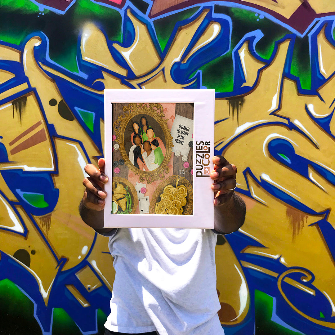 - The artist uses earth tones and messaging inclusive of a family photo with samosas and jalebi on the side, topped with carom pieces and a deck of cards. By transforming this art into puzzle form, this artist remains true to her intent to celebrate the beauty of the present as puzzling also provides yet another opportunity to spend meaningful time with family and friends. Enjoy the company!