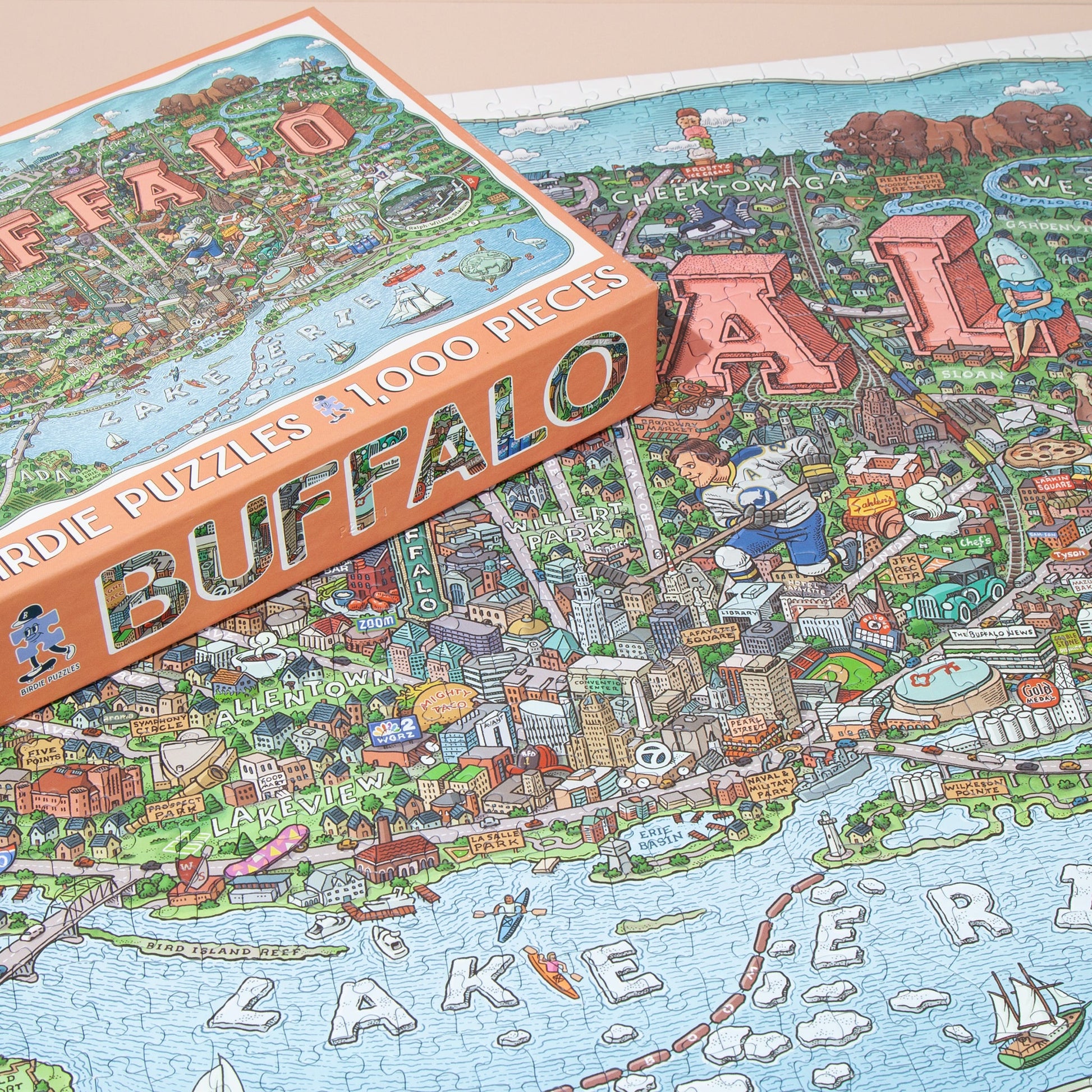 Discover all the cool quirks and unique oddities that makes Buffalo so great with this super fun and incredibly detailed 1,000 piece map puzzle. Featuring restaurants, shops, and icons that locals know and love; you'll have a blast exploring your favorites and discovering something new. Artist Mario Zucca's vibrant and crisp illustrations makes this puzzle a work of art and highly frame worthy. It's the perfect gift for every fan of Buffalo, NY.
