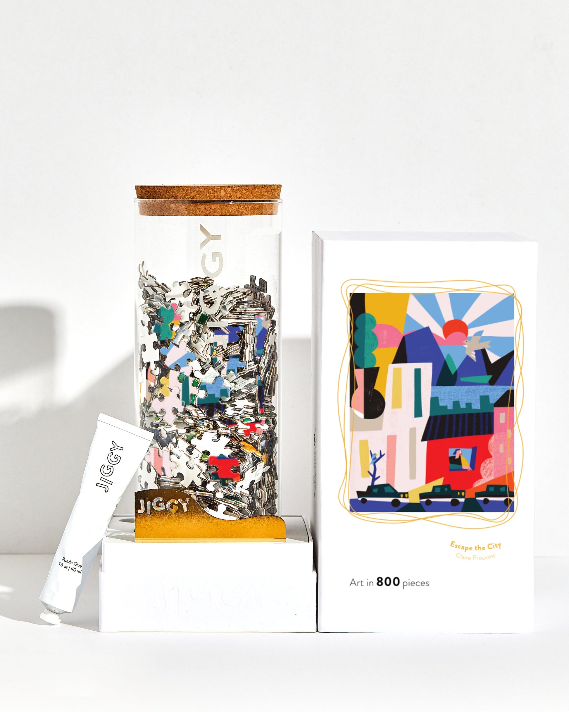 Each JIGGY puzzle comes in a reusable glass jar and includes a tube of puzzle glue, a straight-edge tool to spread the glue and a print of the art to follow