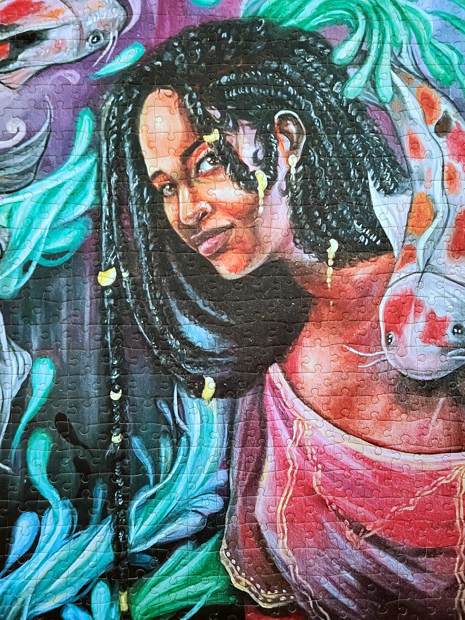- Dive into the mesmerizing world of "Flow", a remarkable 1000 piece puzzle capturing a breathtaking oil on canvas portrait painting. This captivating artwork explores the enchanting connection between the graceful human form and the vibrant underwater realm. Every piece is meticulously crafted to showcase the delicate depiction of a woman elegantly holding a vase, her eyes transfixing the beholder with serene beauty. Koi fish gracefully swim alongside the woman, symbolizing strength, courage, patience, and success through perseverance. As you piece together this artistic masterpiece, you'll feel a sense of serenity and appreciation for the beautiful bond between humans and the marine world.