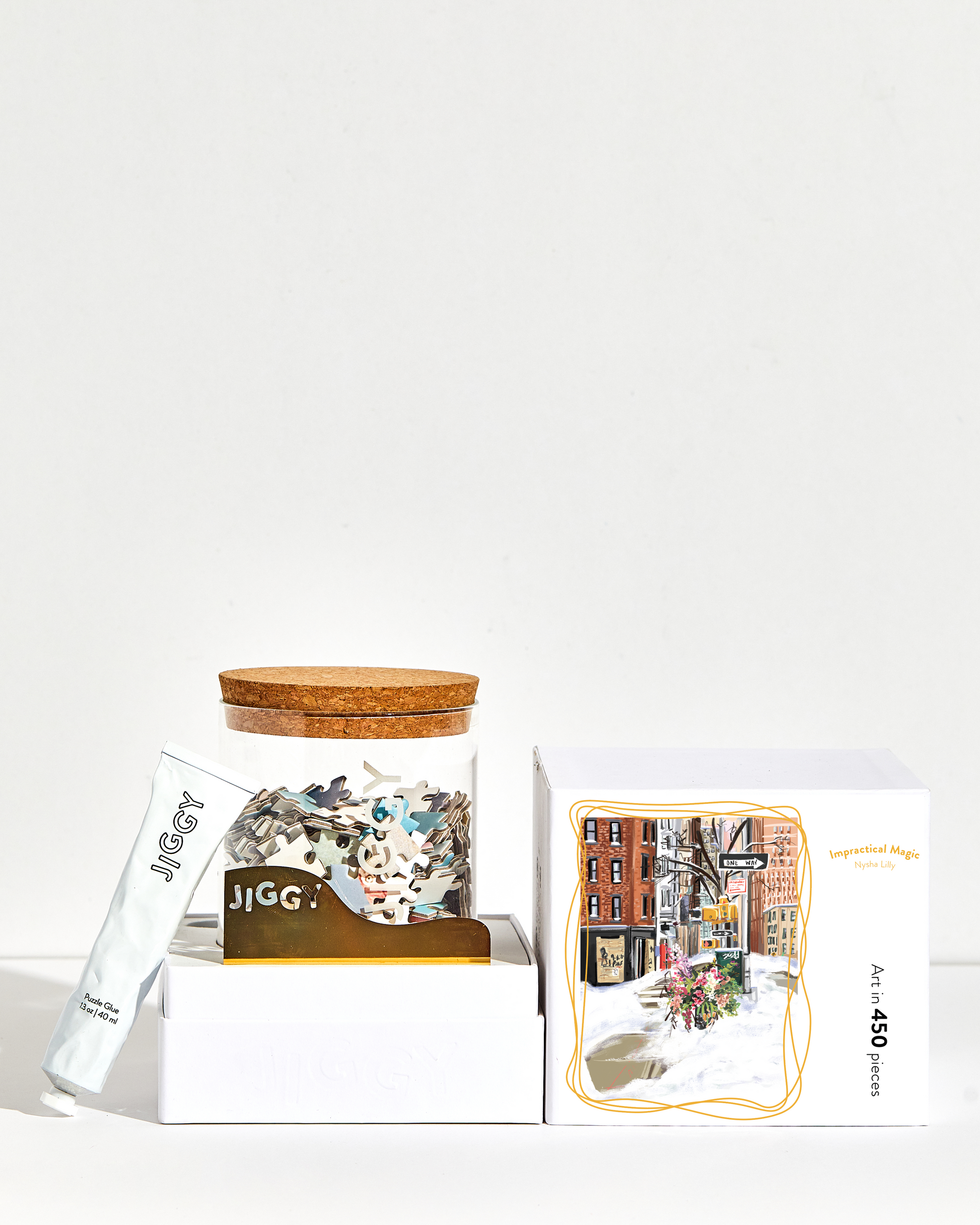 Each JIGGY puzzle comes in a reusable glass jar and includes a tube of puzzle glue, a straight-edge tool to spread the glue and a print of the art to follow.