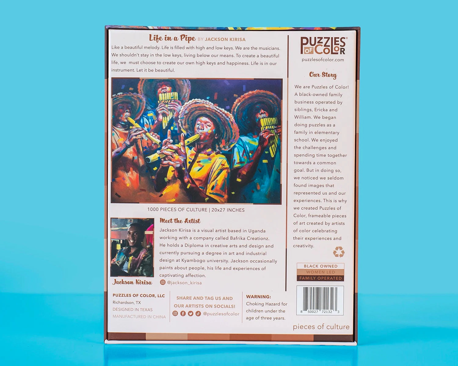 Are you ready to compose your own harmonious symphony of life? Introducing our 1000 piece puzzle, "Life in a Pipe" - a captivating experience that invites you to reflect on the beautiful melody that life can be. "Life in a Pipe" takes you on a journey alongside a quartet of gifted musicians, as they play their hearts out on various wind instruments.