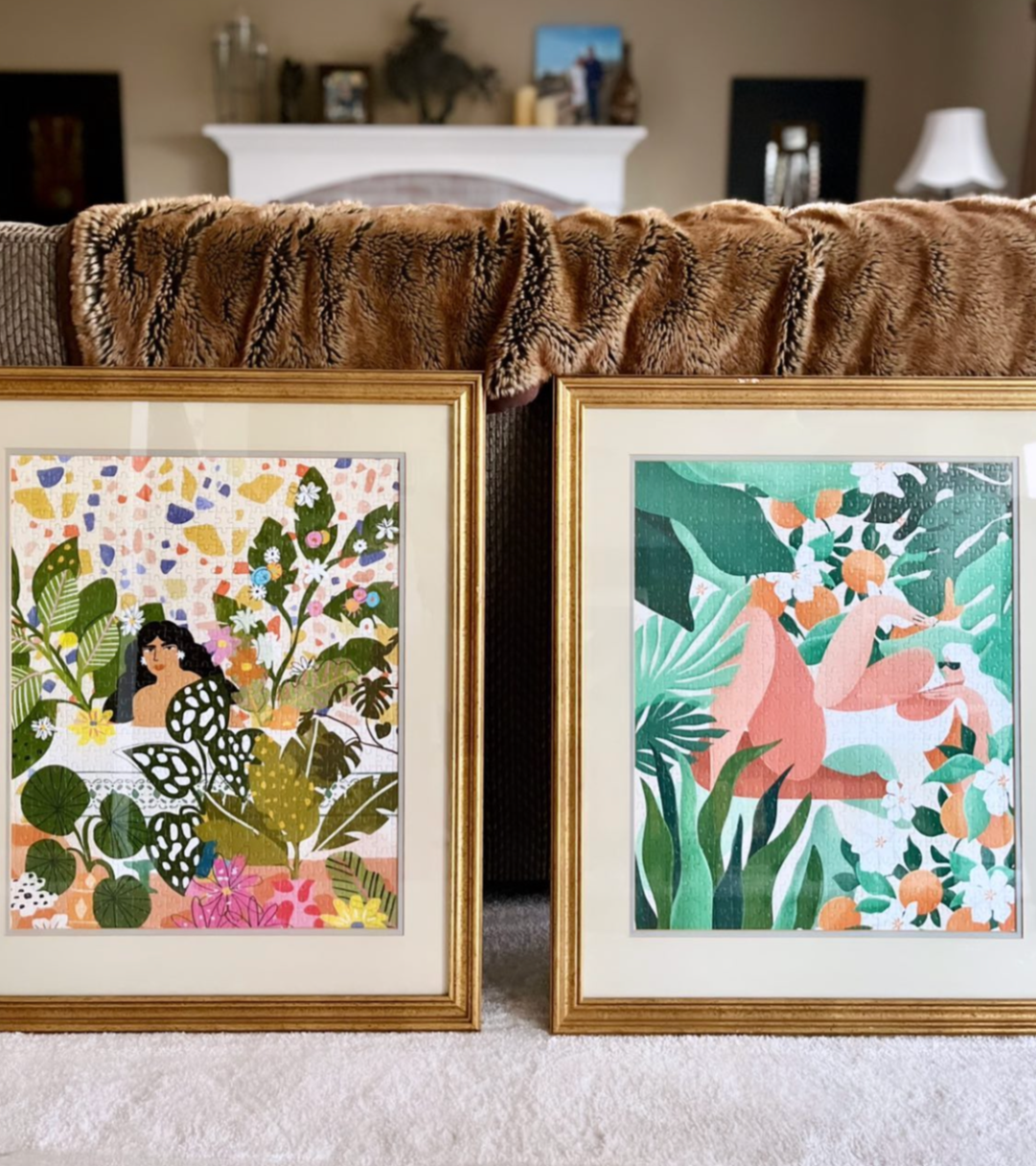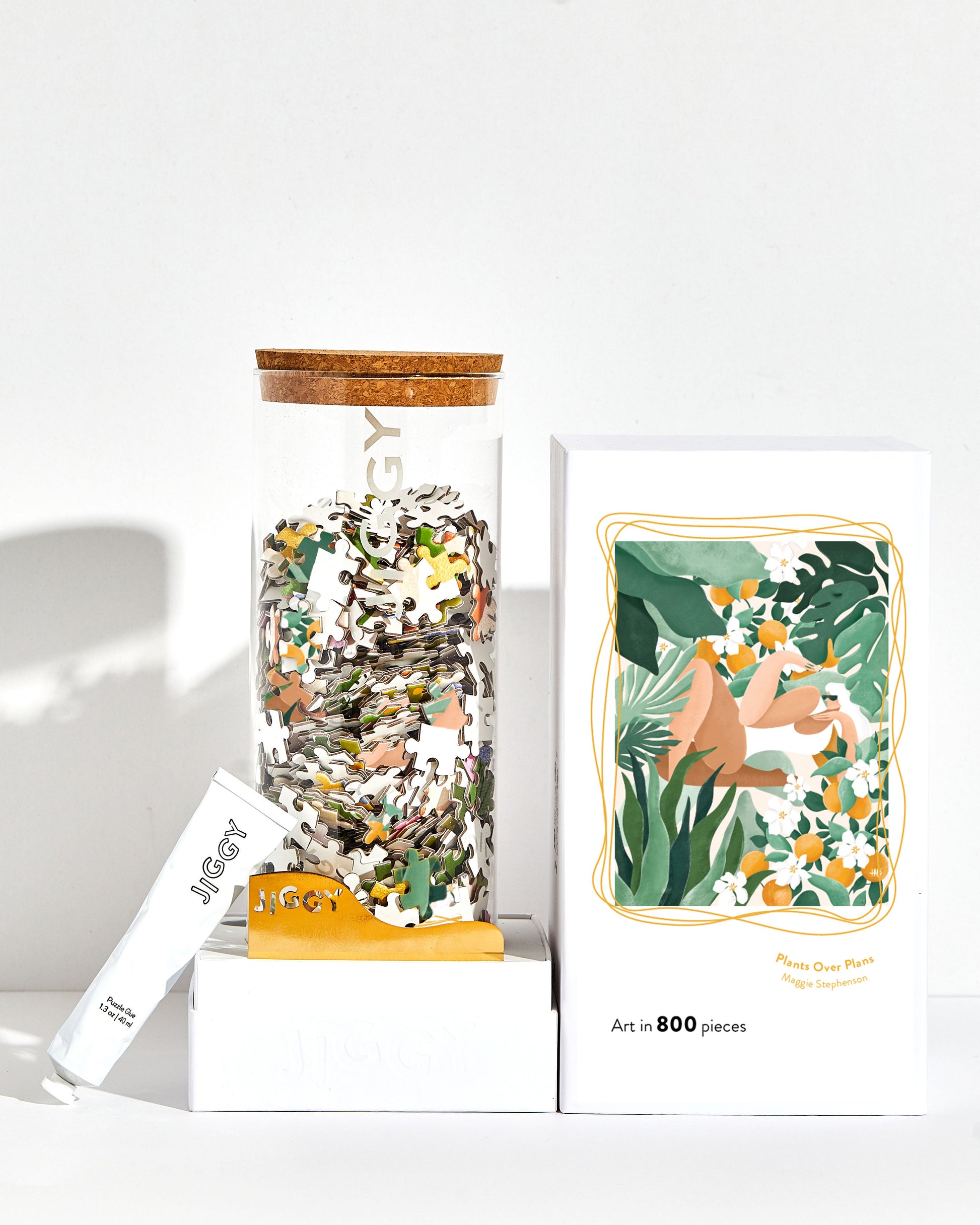 Each JIGGY puzzle comes in a reusable glass jar and includes a tube of puzzle glue, a straight-edge tool to spread the glue and a print of the art to follow.