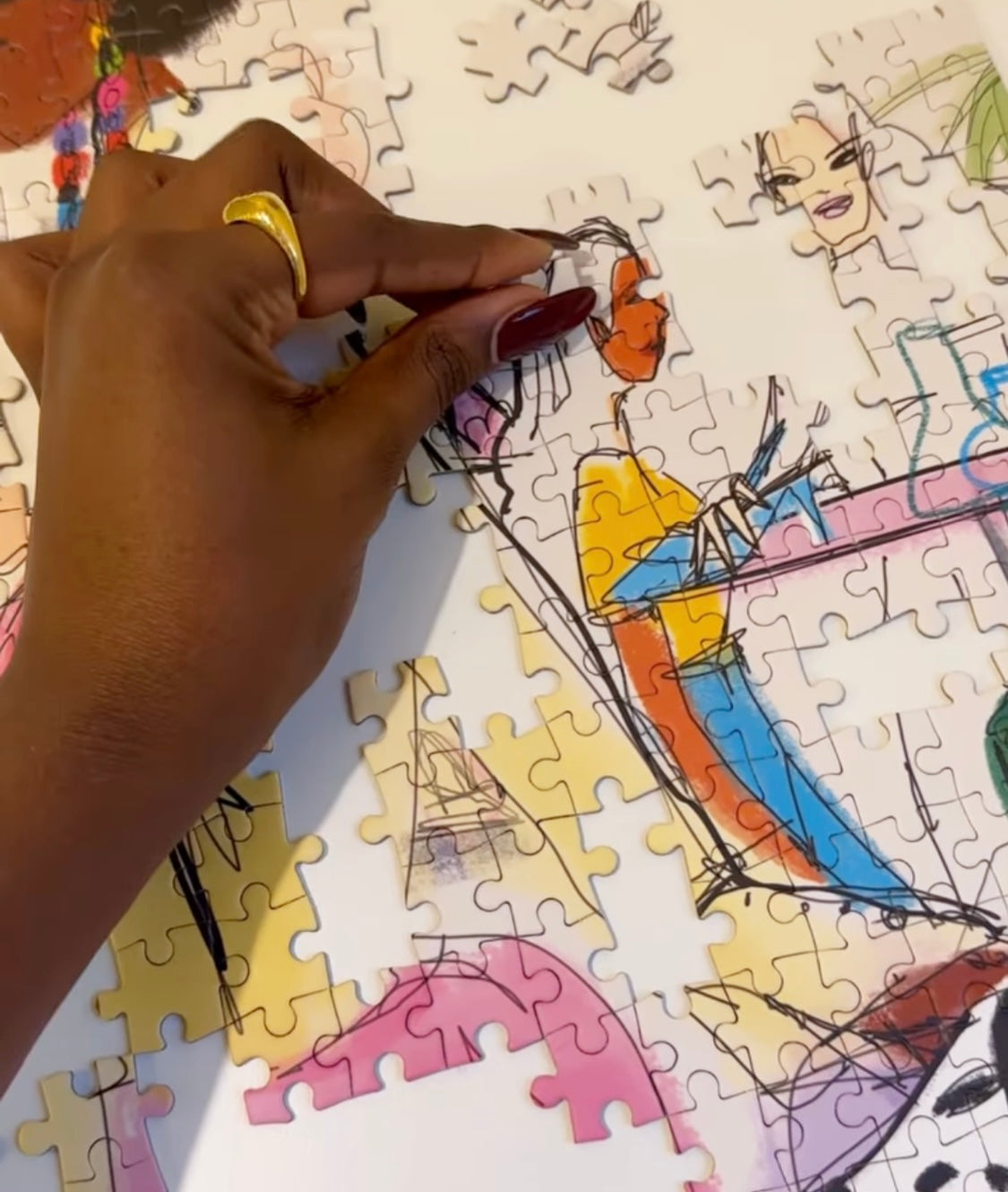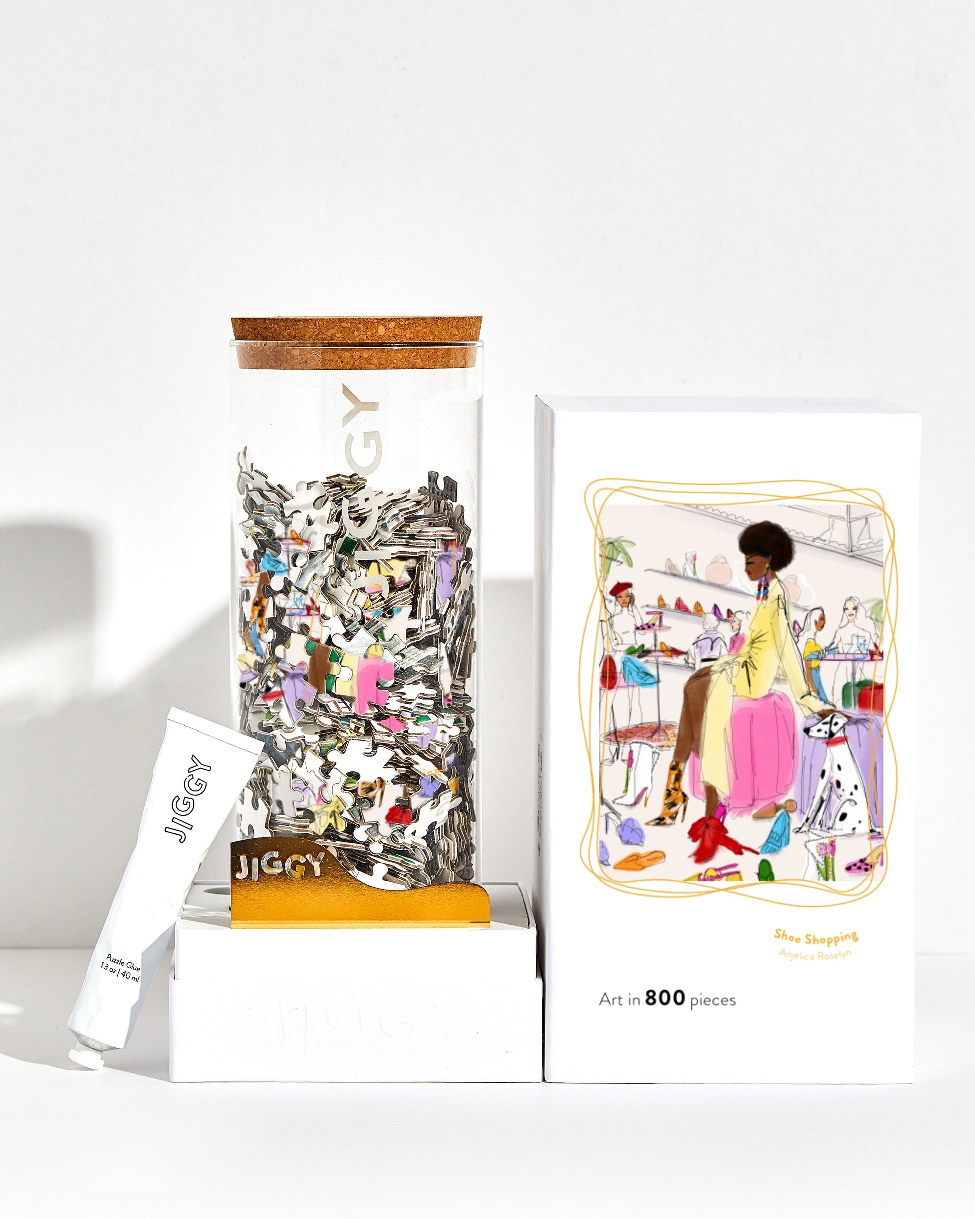 Each JIGGY puzzle comes in a reusable glass jar and includes a tube of puzzle glue, a straight-edge tool to spread the glue and a print of the art to follow.