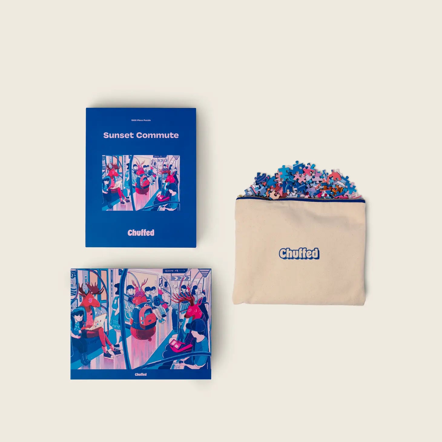 Embark on a journey through an enchanted subway with our 1000 piece jigsaw puzzle, Sunset Commute. Blue and pink hues come together to bring this whimsical scene filled with commuters and some friendly forest creatures to life. As you piece together this intricate puzzle, you'll be transported to a world where city life and nature coexist in harmony. Get your paws on this one!
