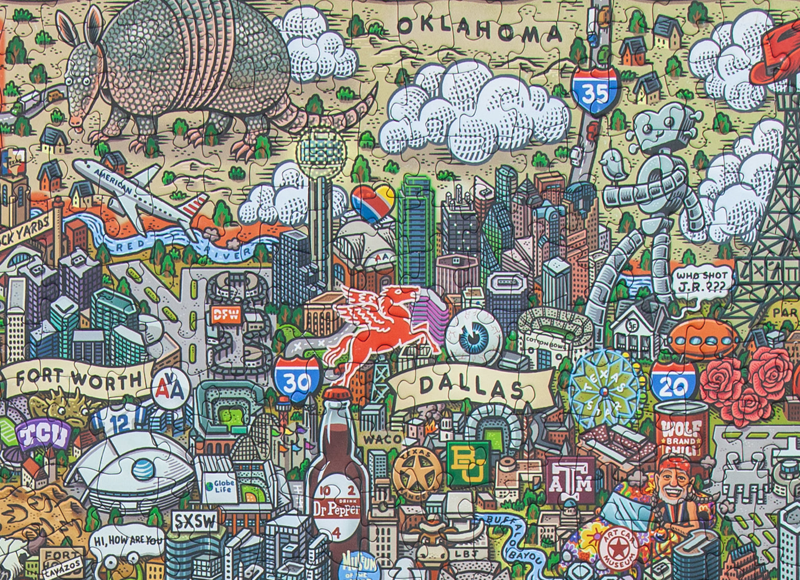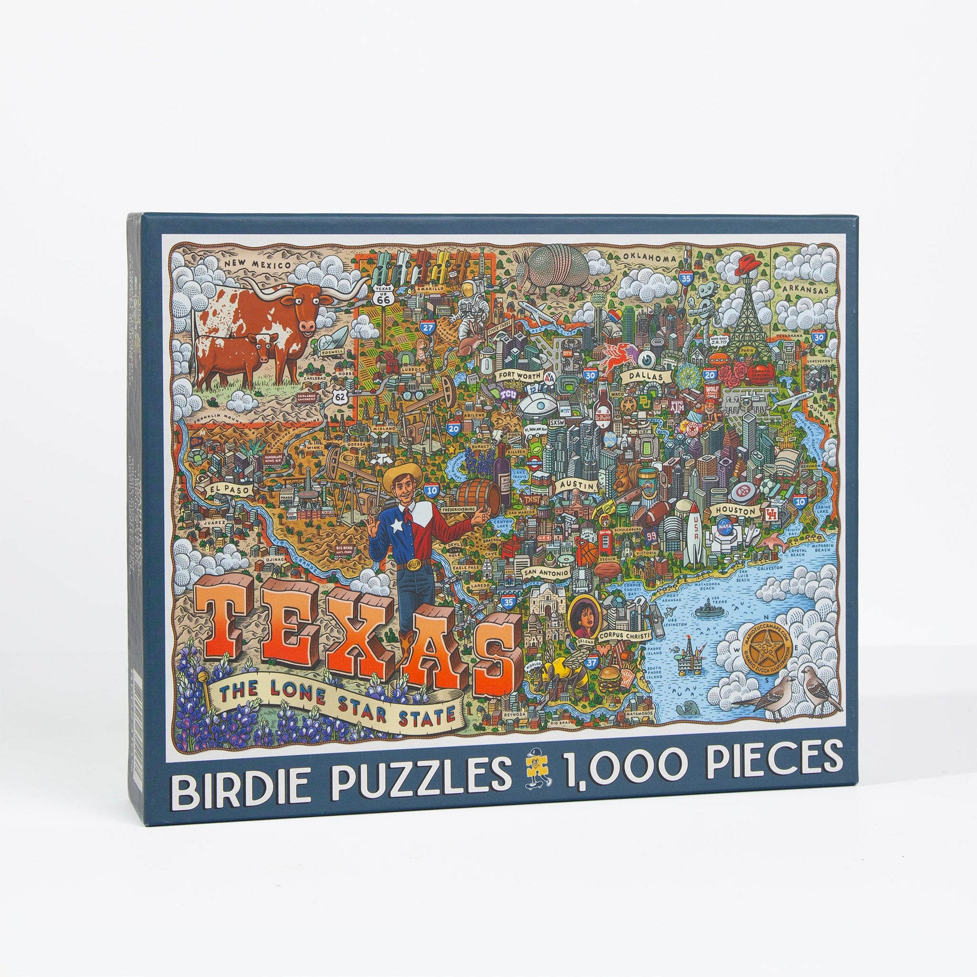Discover all the cool quirks and unique oddities that makes Texas so great with this super fun and incredibly detailed 1,000 piece map puzzle. Featuring restaurants, shops, and icons that locals know and love; you'll have a blast exploring your favorites and discovering something new. Artist Mario Zucca's vibrant and crisp illustrations makes this puzzle a work of art and highly frame worthy. It's the perfect gift for every fan of Texas.