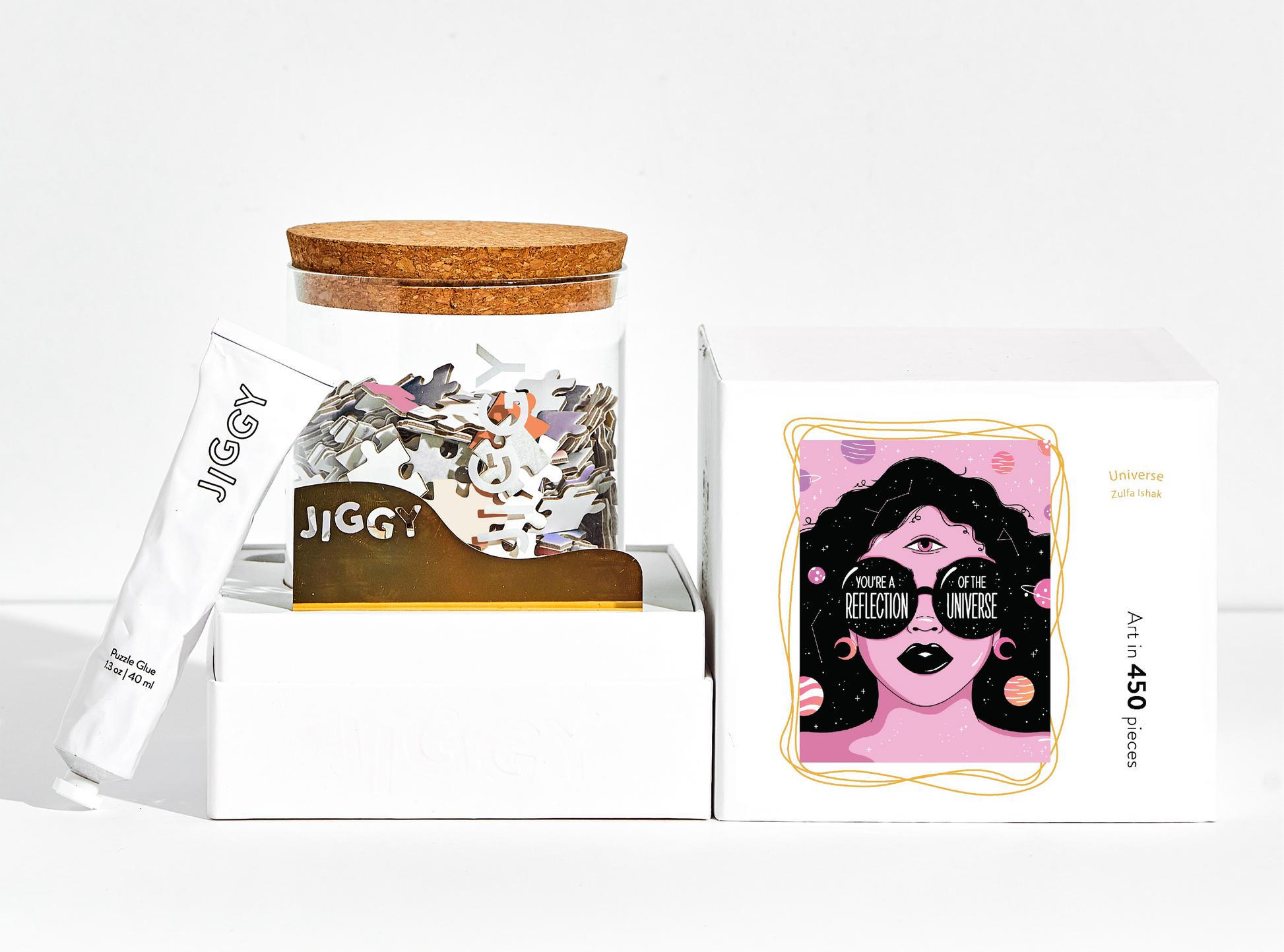 Each JIGGY puzzle comes in a reusable glass jar and includes a tube of puzzle glue, a straight-edge tool to spread the glue and a print of the art to follow.